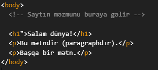 <body> hissəsi saytın görünən hissəsidir. İstifadəçinin brauzerdə gördüyü bütün məzmunlar – mətnlər, şəkillər, düymələr, videolar və s. – burada yerləşir.