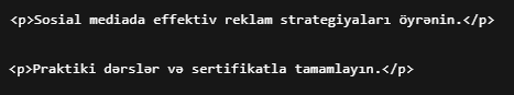 Yəni siz bir cümlə, izah və ya blog mətni yazırsınızsa, onu <p> ilə əhatə etməlisiniz.